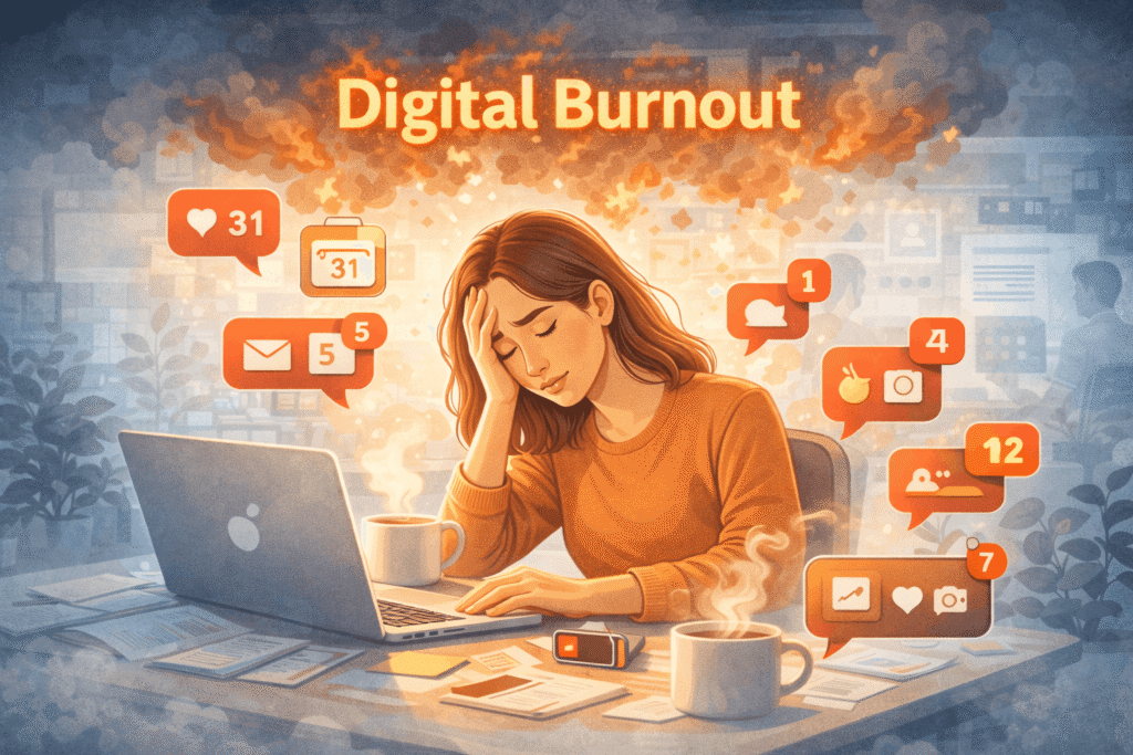 Digital burnout is not just about work. It also comes from scrolling endlessly, consuming too much information, and feeling pressure to always stay updated. Over time, this can affect focus, sleep, and overall mood.